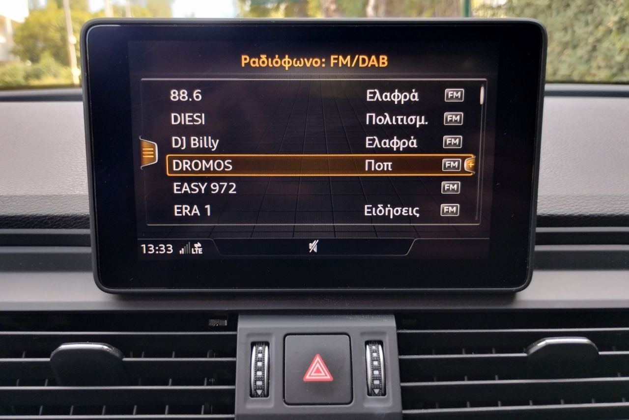 * Ραδιόφωνο: MMI Radio plus - έγχρωμη οθόνη 7 ιντσών - οθόνη οργάνων 5 ιντσών με σύστημα πληροφοριών οδηγού. Διεπαφή Bluetooth - μονάδα μονού CD (MP3, Συμβατό με WMA, AAC) - 1 συσκευή ανάγνωσης καρτών SDXC - 1 θύρα AUX-IN - 1 θύρα φόρτισης USB - ξεχωριστός πίνακας ελέγχου MMI. Ρύθμιση έντασης ήχου ανάλογα με την ταχύτητα, 8 ηχεία (παθητικά) Ψηφιακή λήψη ραδιοφώνου (DAB) εκτός από την επιλογή αναλογικού σταθμού Λήψη ψηφιακά μεταδιδόμενων ραδιοφωνικών σταθμών σύμφωνα με το πρότυπο DAB, συμπεριλαμβανομένου του ήχου DAB+ και DMB. Εμφάνιση πληροφοριών που σχετίζονται με το πρόγραμμα (π.χ. καλλιτέχνης, τίτλος) καθώς και πρόσθετες πληροφορίες με τη μορφή παρουσίασης (π.χ. εξώφυλλο, καιρός). Με το MMI Navigation plus και άνω, ένας δεύτερος δέκτης DAB αναζητά συνεχώς εναλλακτικές συχνότητες λήψης για τον επιλεγμένο σταθμό. Διεπαφή για εξωτερική χρήση AUX-IN και USB.